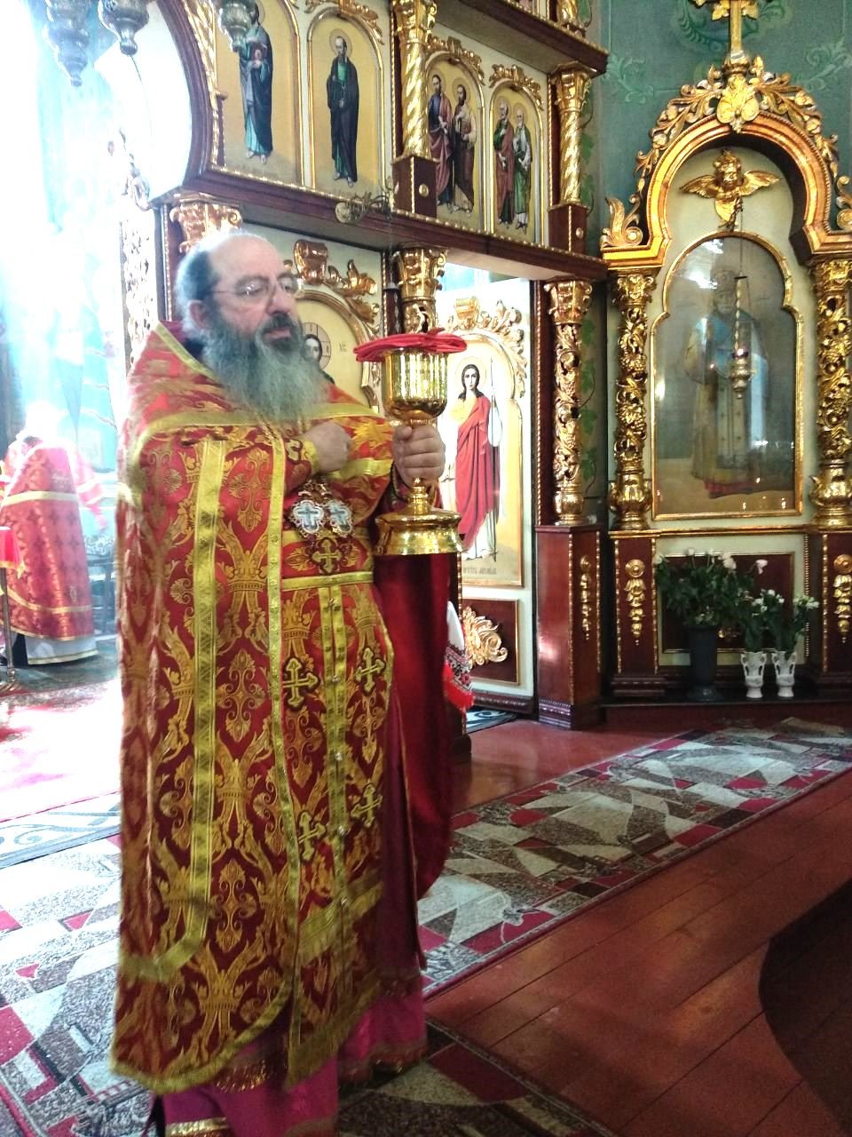 Благочинний Бердичівського округу, настоятель Свято-Миколаївського собору архімандрит Варфоломій (Бойков) зачитує Огласительне слово Святого Іоанна Златоуста.