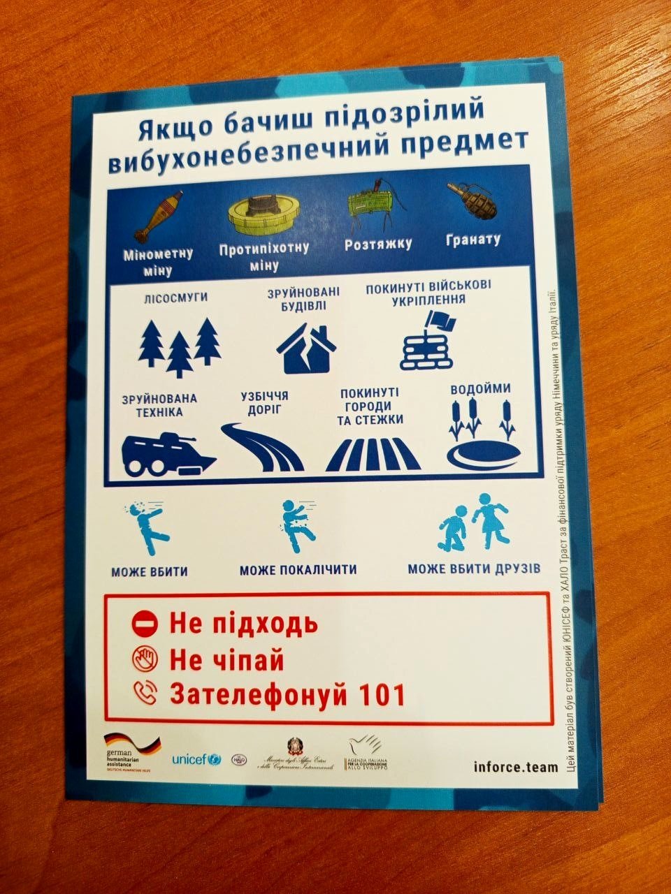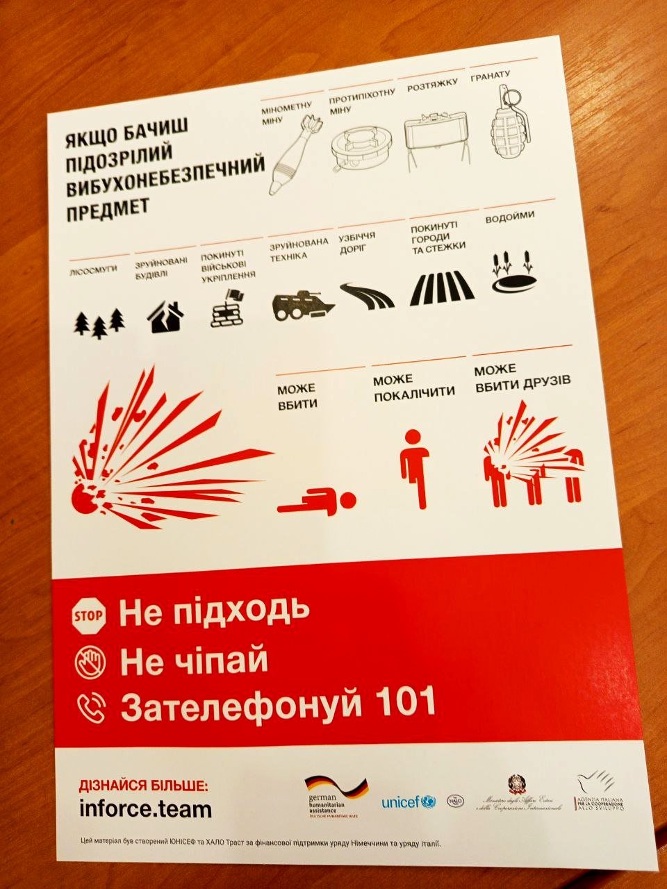 – слід бути пильними та уважними при виявленні вибухонебезпечних пристроїв, які нерідко виглядають, як побутові предмети чи іграшки, не підходити до них, торкатись і пересувати, а негайно повідомити про небезпечну знахідку в органи місцевої влади, поліцію і пожежну службу;