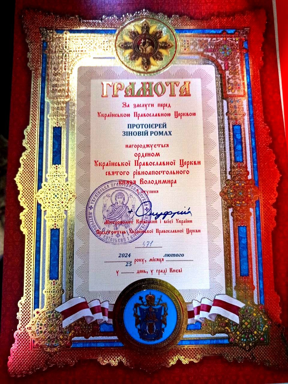 З благословення Блаженнішого Митрополита Київського і всієї України Онуфрія Високопреосвященніший Никодим, митрополит Житомирський і Новоград-Волинський, вручив протоієрею Зіновію Ромаху Грамоту за заслуги перед Українською Православною Церквою та орден Святого Рівноапостольного князя Володимира І ступеня.